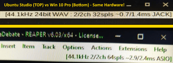 On Ubuntu Studio, those numbers dropped to 32 samples and about 2.1 milliseconds (0.7 ms in and 1.4ms out).